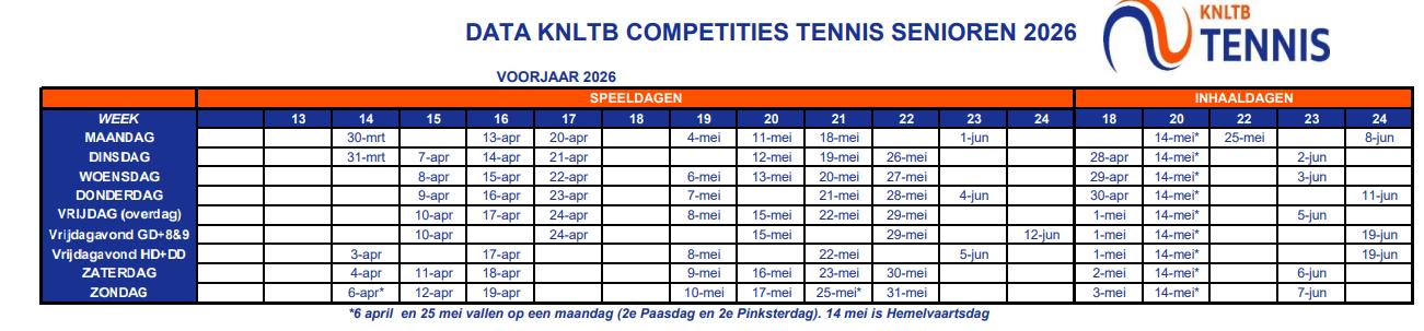 - Wedstrijden die niet op de geplande datum gespeeld kunnen worden vanwege vakanties, feestdagen of een incompleet team, kunnen ingehaald worden volgens de regels van de KNLTB. Een wedstrijd verplaatsen (eerder of later dan de officiële speeldatum) mag in onderling overleg met de tegenstander, mits de wedstrijd voor de laatste speeldag wordt gespeeld en niet op een inhaaldag. Inhaaldata zijn enkel bestemd voor wedstrijden worden afgelast wegens weersomstandigheden.